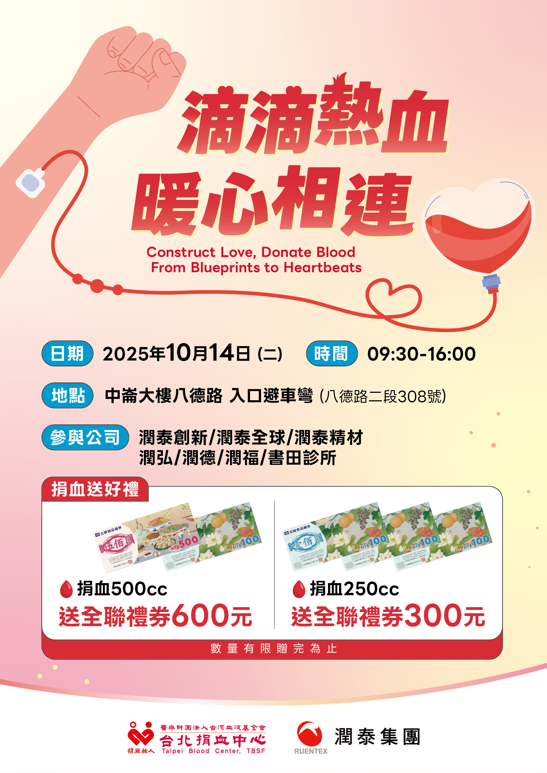 潤泰集團秉持「潤澤社會,泰安民生(A better life for the people and the society)」的理念,繼 2024 年首度舉辦集團捐血活動獲得熱烈迴響後,今年再度號召員工與社會大眾共襄盛舉,於 2025 年 10 月 14 日(二) 在中崙大樓八德路入口避車彎舉辦第二屆「滴滴熱血,暖心相連」捐血活動。